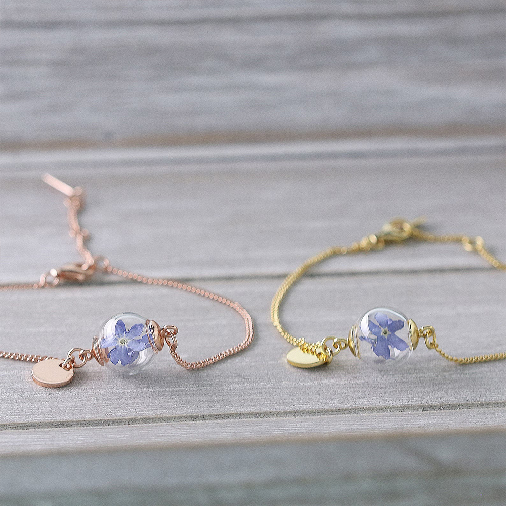Love bracelet with glass orb filled with real and dried forget me not from our own garden.
