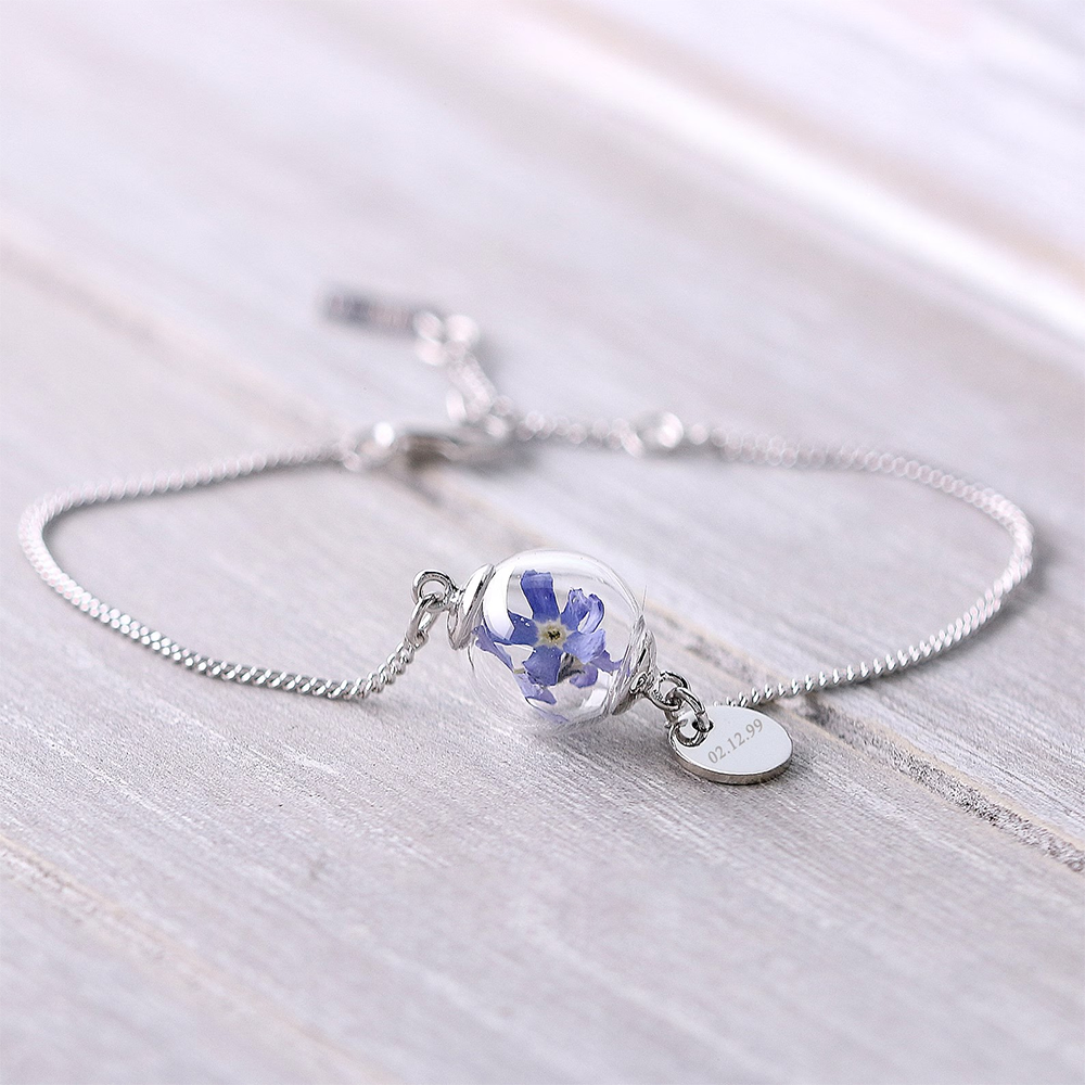 Love bracelet with glass orb filled with real and dried forget me not from our own garden.