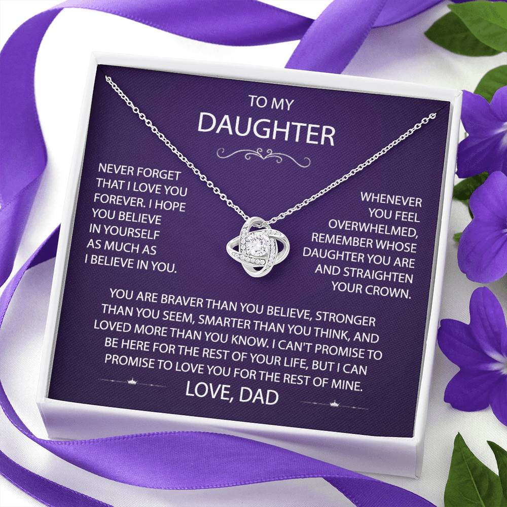 " To My Daughter - Never forget that I love you forever. I hope you believe in yourself as much as I believe in you. Whenever you feel overwhelmed, remember whose daughter you are. And straighten your crown. You are Braver than you believe, Stronger than you seem, Smarter than you think, and loved more than you know. I can't promise to be here for the rest of your life, but I can promise to love you for the rest of mine. Love, Dad. "